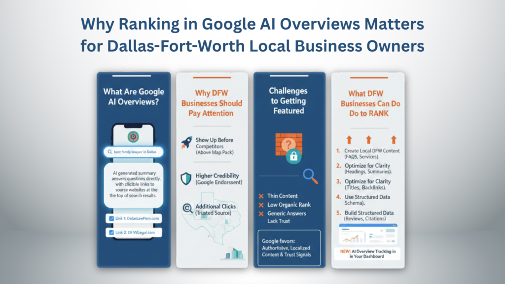 Google’s AI Overviews are changing how people find businesses online—and for Dallas-Fort Worth local business owners managing local SEO and regional marketing, this shift is especially important.